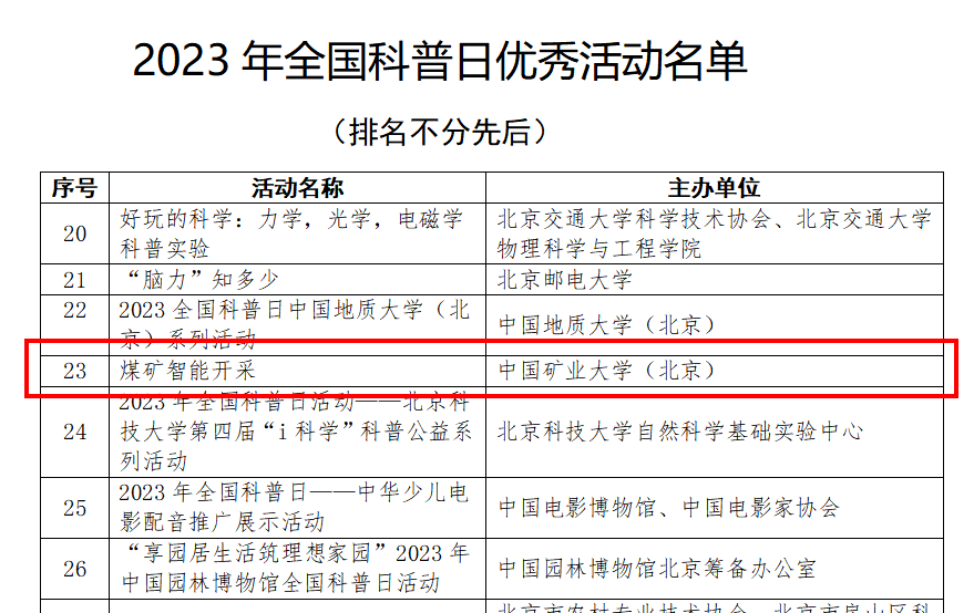 Recently, China Association for Science and Technology announced the assessment results of the 2023 National Science Popularization Day activities. Through comprehensive evaluation, a total of 1749 activities were rated as excellent activities for the event. Our university's "Intelligent Coal Mining" science popularization activity was successfully included in the list of excellent activities.