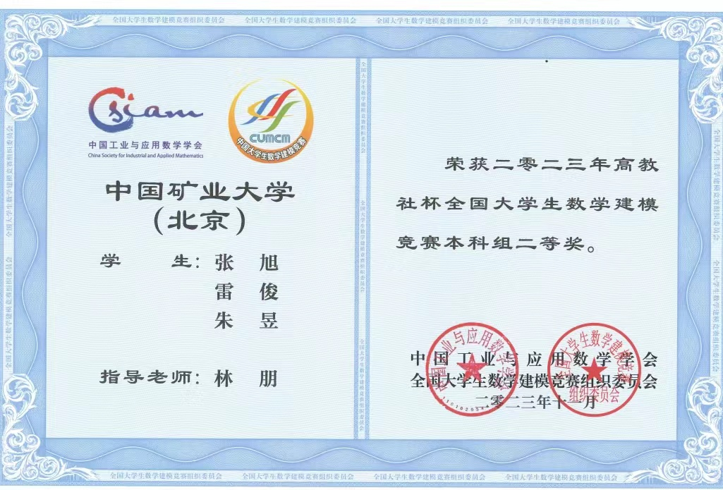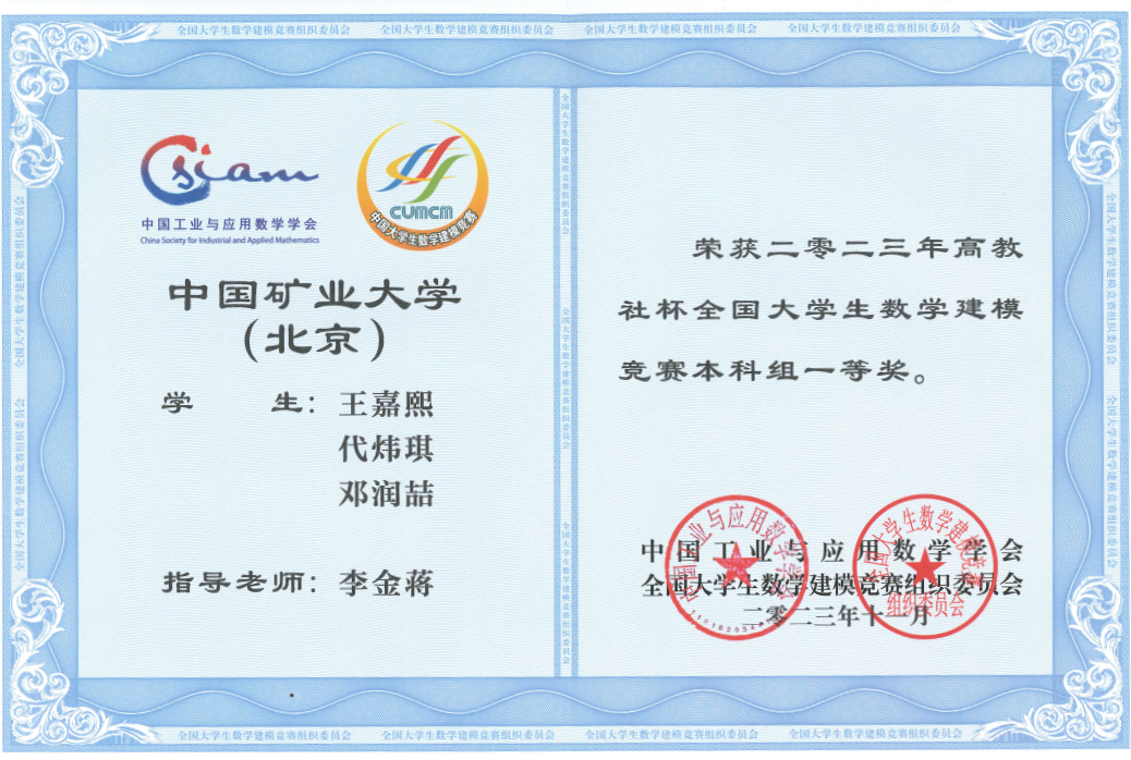 In 2023, the National College Student Mathematical Modeling Competition saw a record-breaking participation with over 16835 institutions/campuses and 59611 teams from across China, the United States, Australia and Malaysia. Our university only participated in the undergraduate group, with a total of 54158 teams, comprising nearly 180,000 CUMTB students, setting a new record for the number of participants in the competition's history. Led by faculty members from the School of Science, 40 CUMTB teams successfully registered for the competition. Wang Jiaxi, Dai Weiqi, and Deng Runzhe from the School of Science received the national first prize in the undergraduate group. Due to the increasing number of participating teams each year with a fixed number of awarded teams, the award-winning rate decreases annually. This year, the national first prize-winning rate was approximately 0.55%. Zhang Xu and Lei Jun from the School of Science, along with Zhu Yu from the School of Artificial Intelligence, received the national second prize, with an award-winning rate of approximately 2.2%.