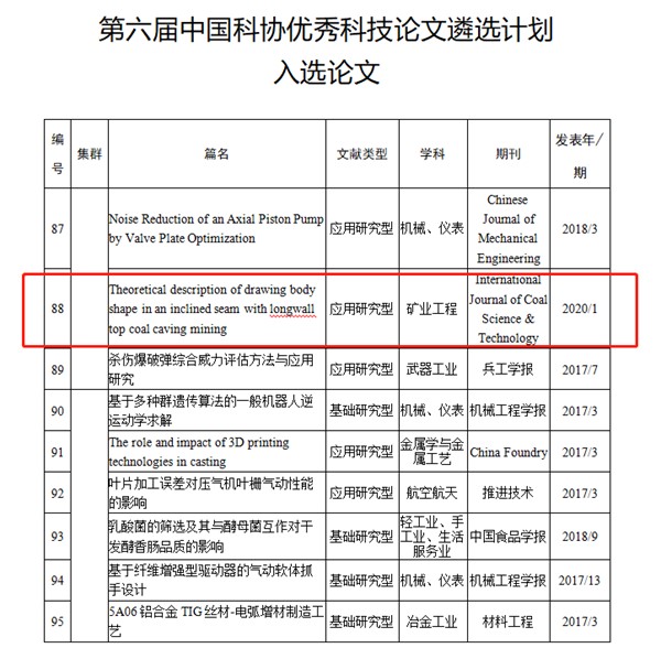 Recently, the China Association for Science and Technology (CAST) announced the list of selected papers for the 6thCAST Outstanding Scientific and Technological Paper Selection Program. Our university's School of Energy and Mining Engineering, including professors Wang Jiachen, Wei Weijie, and Zhang Jinwang, had their paper titled "Theoretical description of drawing body shape in an inclined seam with longwall top coal caving mining", published in the journal "International Journal of Coal Science & Technology" in 2020, successfully selected for this honor.