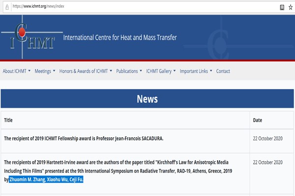 The International Centre for Heat and Mass Transfer (ICHMT), established in 1968 and supported by UNESCO since 1970, is the foremost international academic organization in the field of heat and mass transfer. The Hartnett-Irvine Award, established in 2007 to honor the founders, Professor Hartnett and Professor Irvine, is awarded annually to one outstanding paper selected from thousands presented at various international conferences organized or co-organized by ICHMT. The three scientists awarded this year are the 13threcipients of the award.