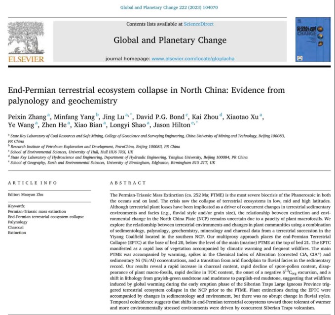 On September 17, Professor Shao Longyi and Professor Lu Jing's team from our university, with Dr. Zhang Peixin as the lead author, won the prestigious 2024 Dal Swaine Award at the 40thannual meeting of The Society for Organic Petrology (TSOP) held in Ulaanbaatar, Mongolia, for their paper titled "End-Permian terrestrial ecosystem collapse in North China: Evidence from palynology and geochemistry". This is a high recognition of the outstanding contributions made by our university's faculty and students in the fields of coal geochemistry and environmental geochemistry. It is reported that this is the second time our university and the third time for China to receive this award, with previous winners mainly coming from countries such as the United States, New Zealand, Australia, Canada, Japan, Germany, and Switzerland.