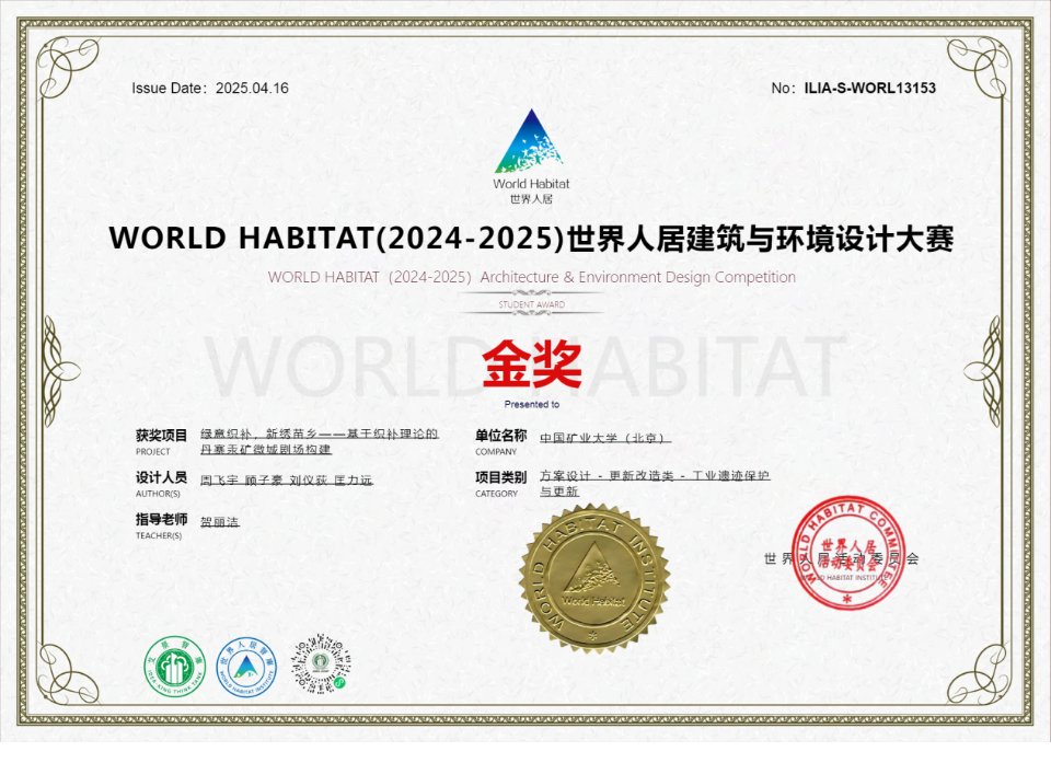 Recently, the results of the WORLD HABITAT (2024-2025) World Habitat Architecture and Environmental Design Competition were announced. Zhou Feiyu, Gu Zihao, Liu Yidi, and Kuang Liyuan, undergraduate students of the 2021 grade in the Architecture major at the School of Mechanics and Civil Engineering, China University of Mining and Technology-Beijing, under the guidance of Teacher He Lijie, won the Gold Award in the Renovation and Regeneration category (this competition awarded 2 Gold Awards, 4 Silver Awards, 6 Bronze Awards, and 3 Merit Awards in this category) with their work titled "Weaving Green into the New Rustic Township - Constructing the Danzhai Mercury Mine Micro-City Theatre Based on the Theory of Weaving and Patching." They stood out among 563 entries from around the globe.