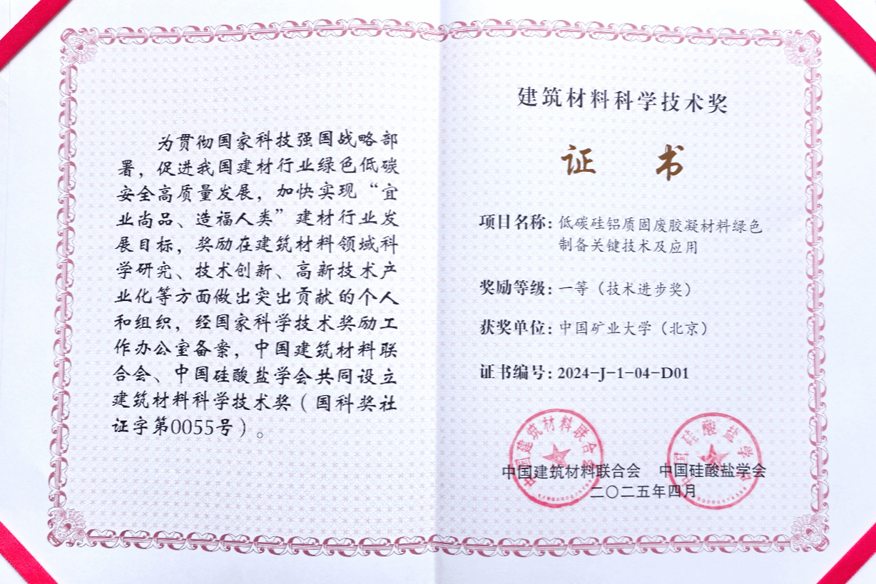 The project “Key Technologies and Applications for the Green Preparation of Low-Carbon Aluminosilicate Solid-Waste-Based Cementitious Materials” centers on the development of a novel cementitious system and carries out in-depth research on the large-scale, stable, and low-carbon utilization of bulk industrial solid waste to produce new aluminosilicate-based cementitious materials. The team developed technologies to enhance the reactivity and stabilize the quality of multi-source aluminosilicate solid wastes, and established a new low-carbon cementitious material system based on multicomponent aluminosilicates. In addition, new green preparation technologies for low-carbon aluminosilicate solid-waste-based cementitious materials were developed, along with application technologies for typical engineering scenarios, including radioactive waste disposal, road subgrade construction, goaf backfilling, and building engineering. These innovations have significantly improved the adaptability of the materials and provided strong support for national infrastructure development and specialized engineering projects.